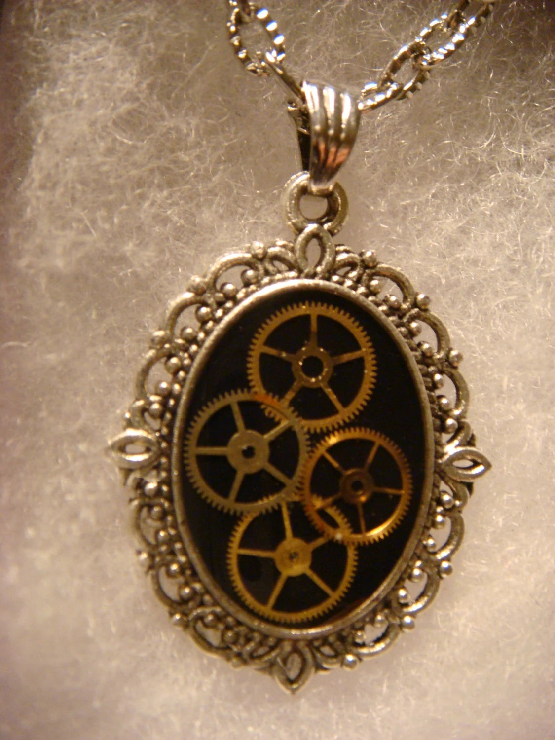 This beautiful steampunk necklace features vintage upcycled watch part gears over a hand painted black background embedded in resin in an ornate antique silver setting.
