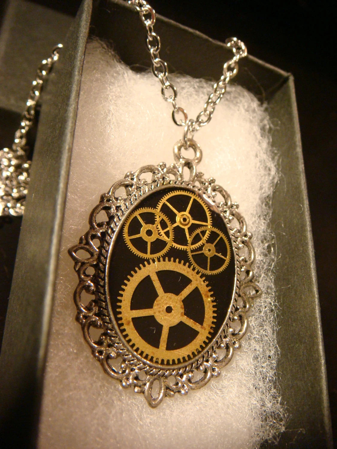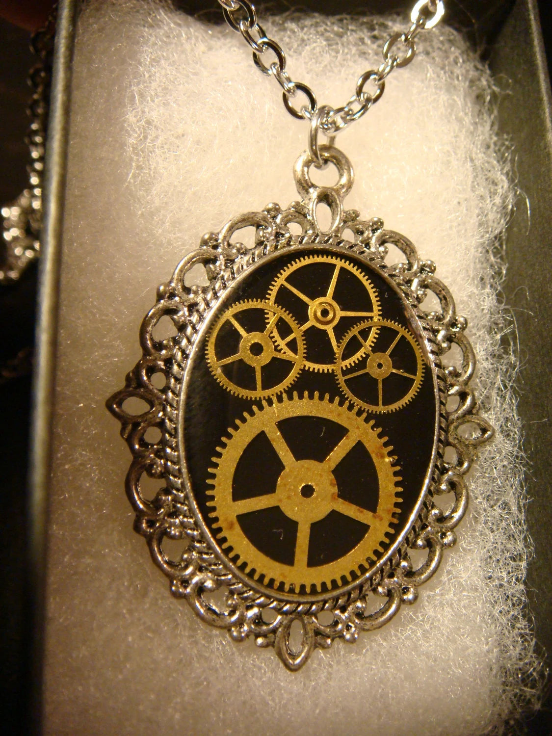 This beautiful necklace features vintage upcycled watch part gears over a hand painted black background embedded in resin in an ornate antique silver setting.