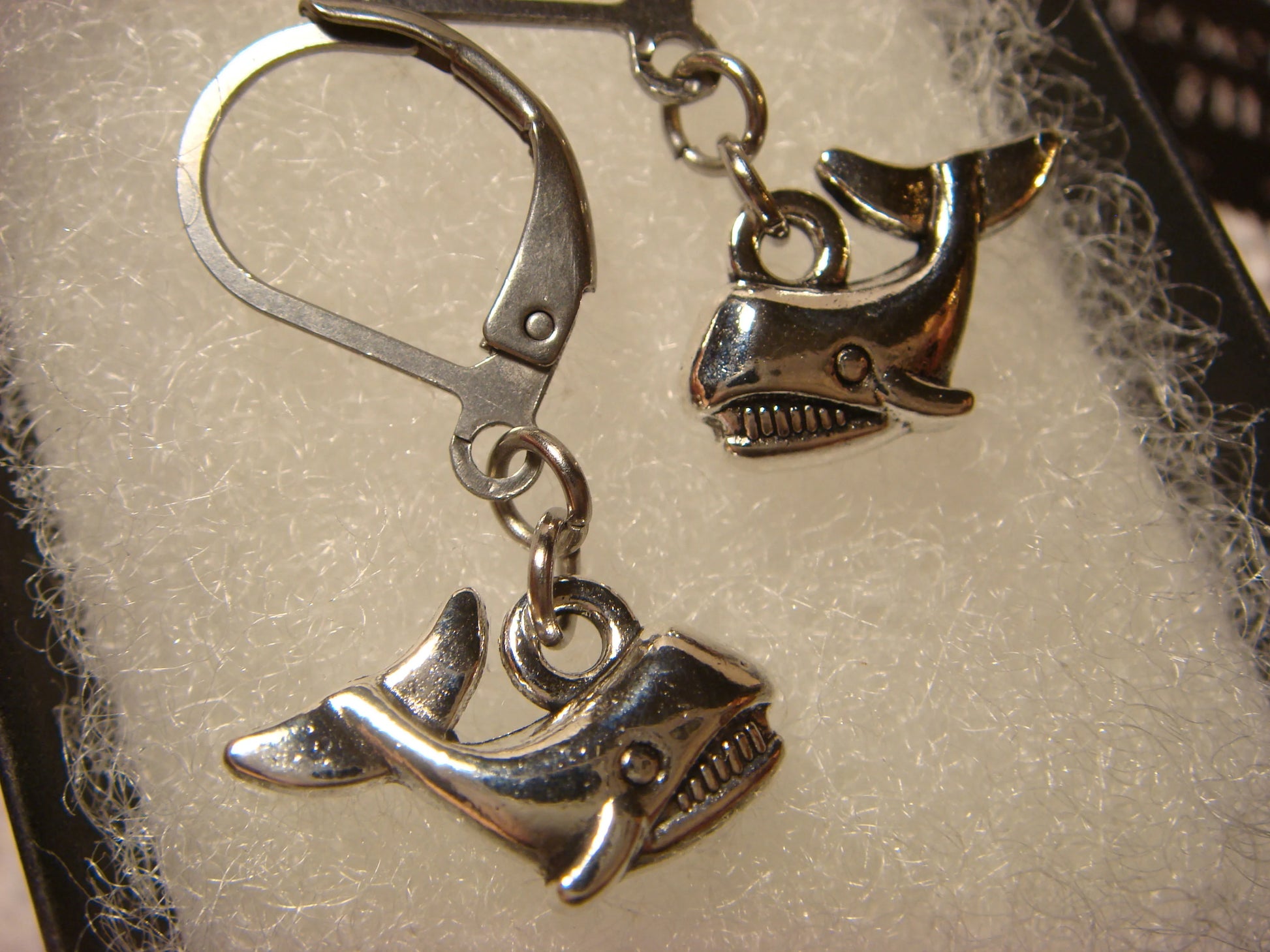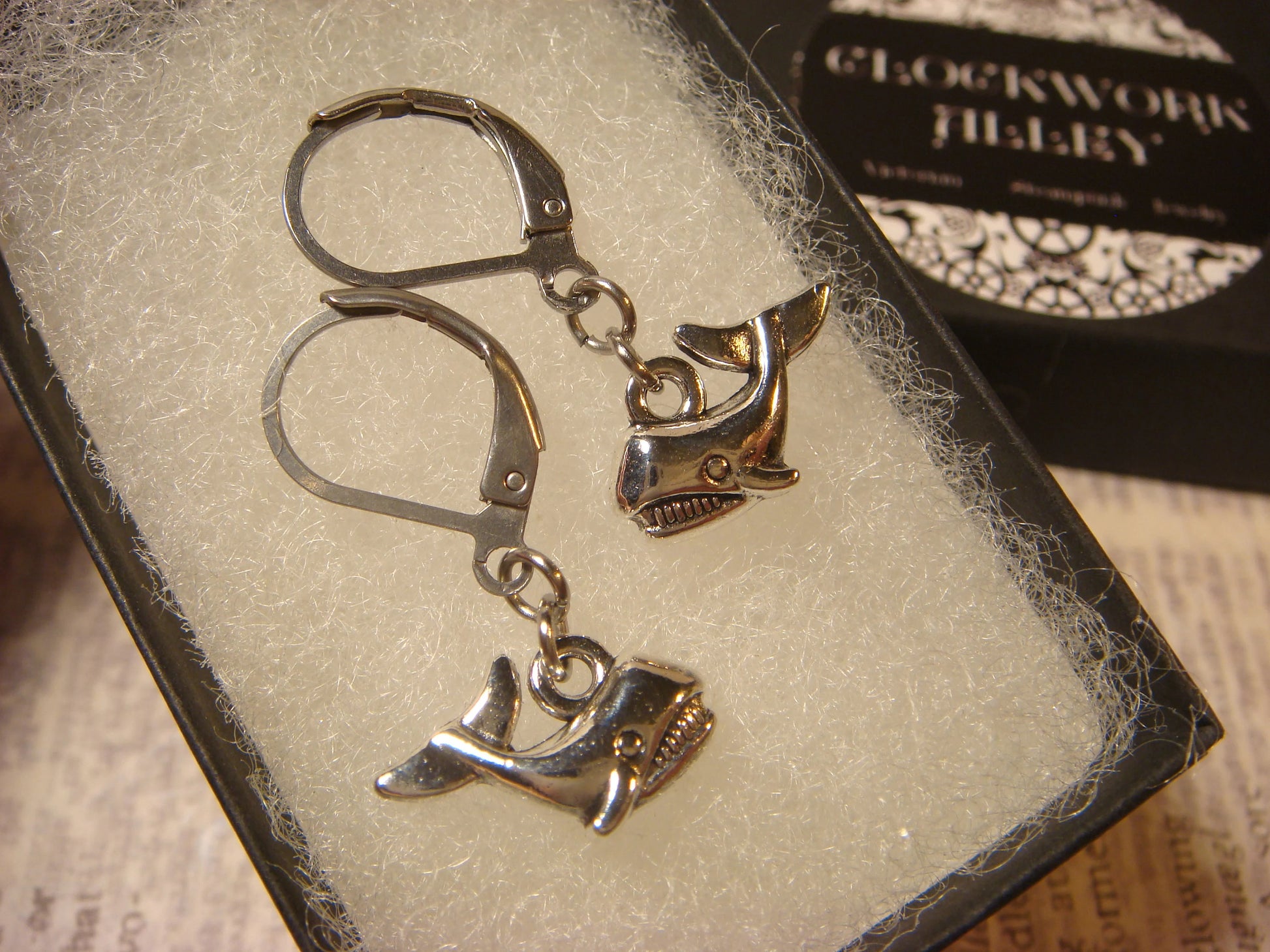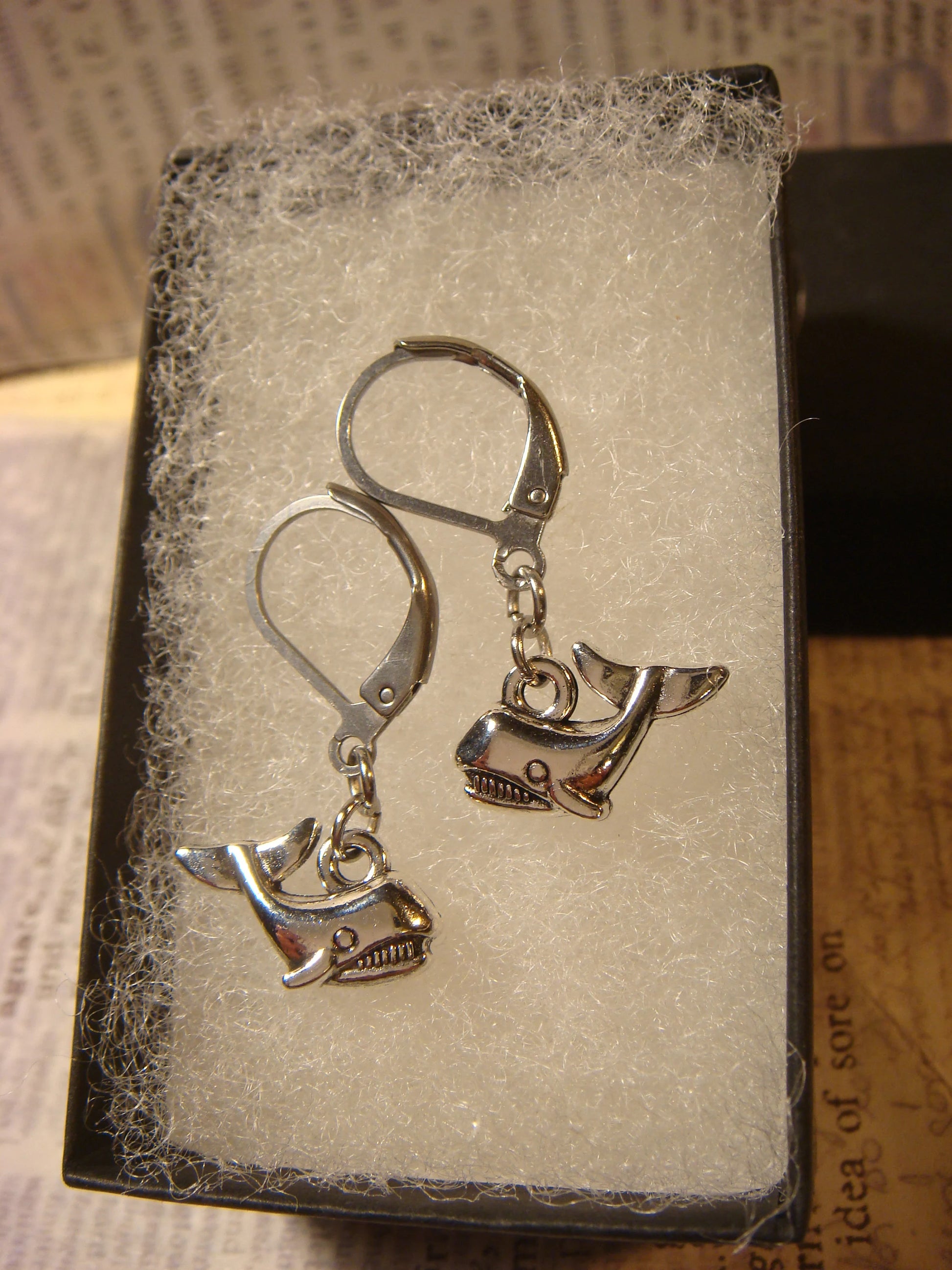 These earrings are made with antique silver whales hanging on stainless steel lever back earrings.