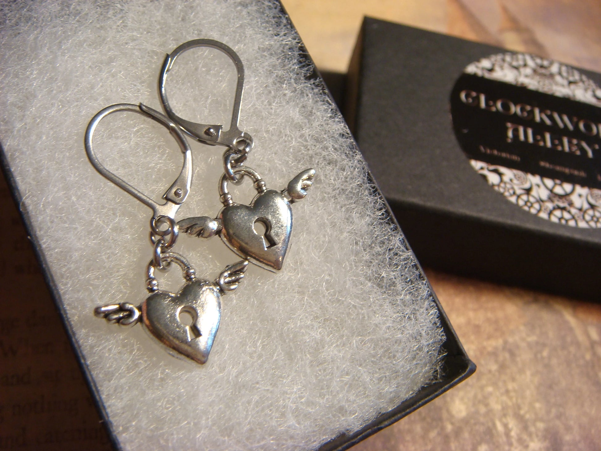 These earrings are made with antique silver winged heart lock charms hanging on stainless steel lever back earrings.