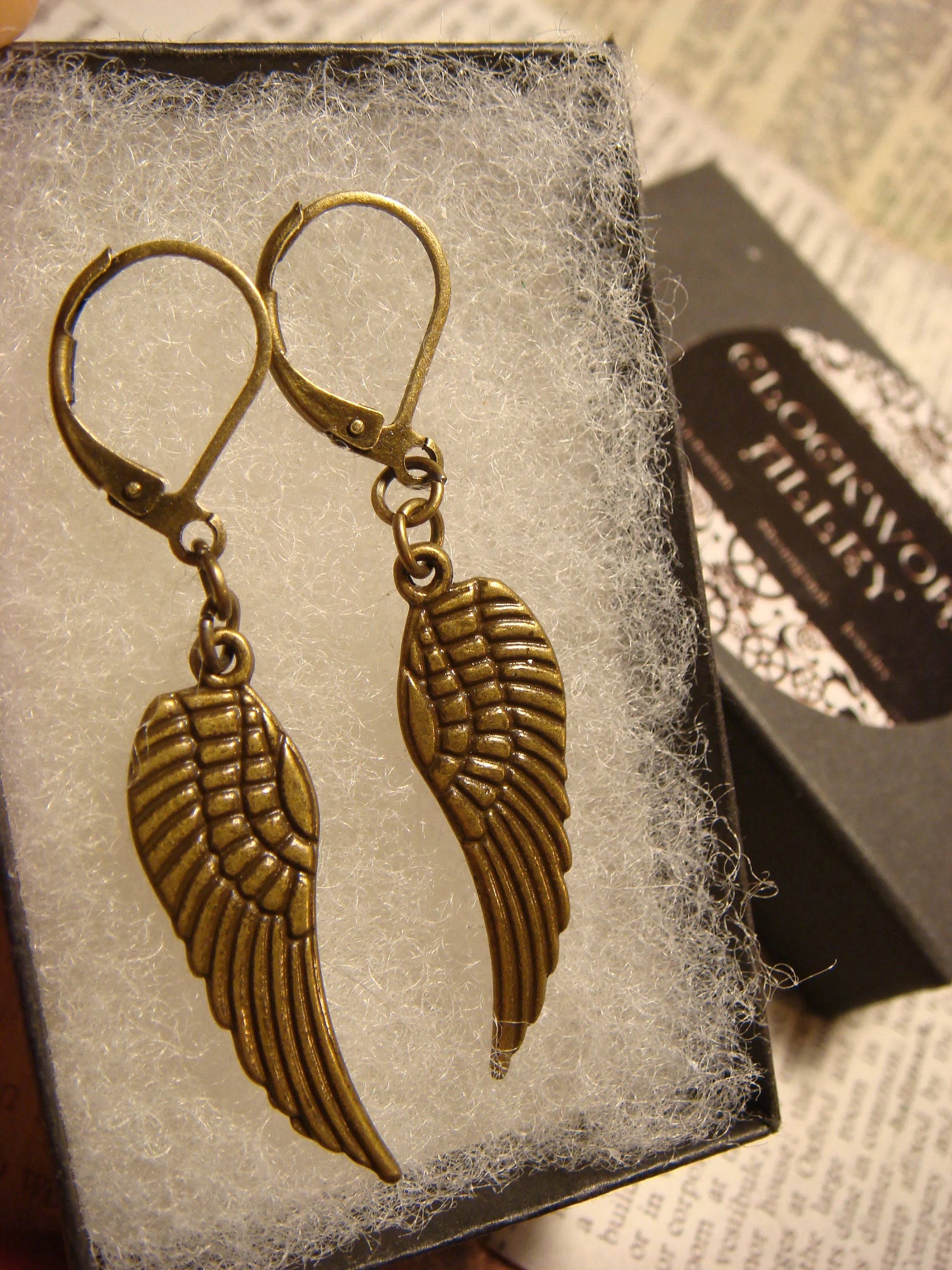These earrings are made with antique bronze wing charms hanging on antique bronze lever back earrings.