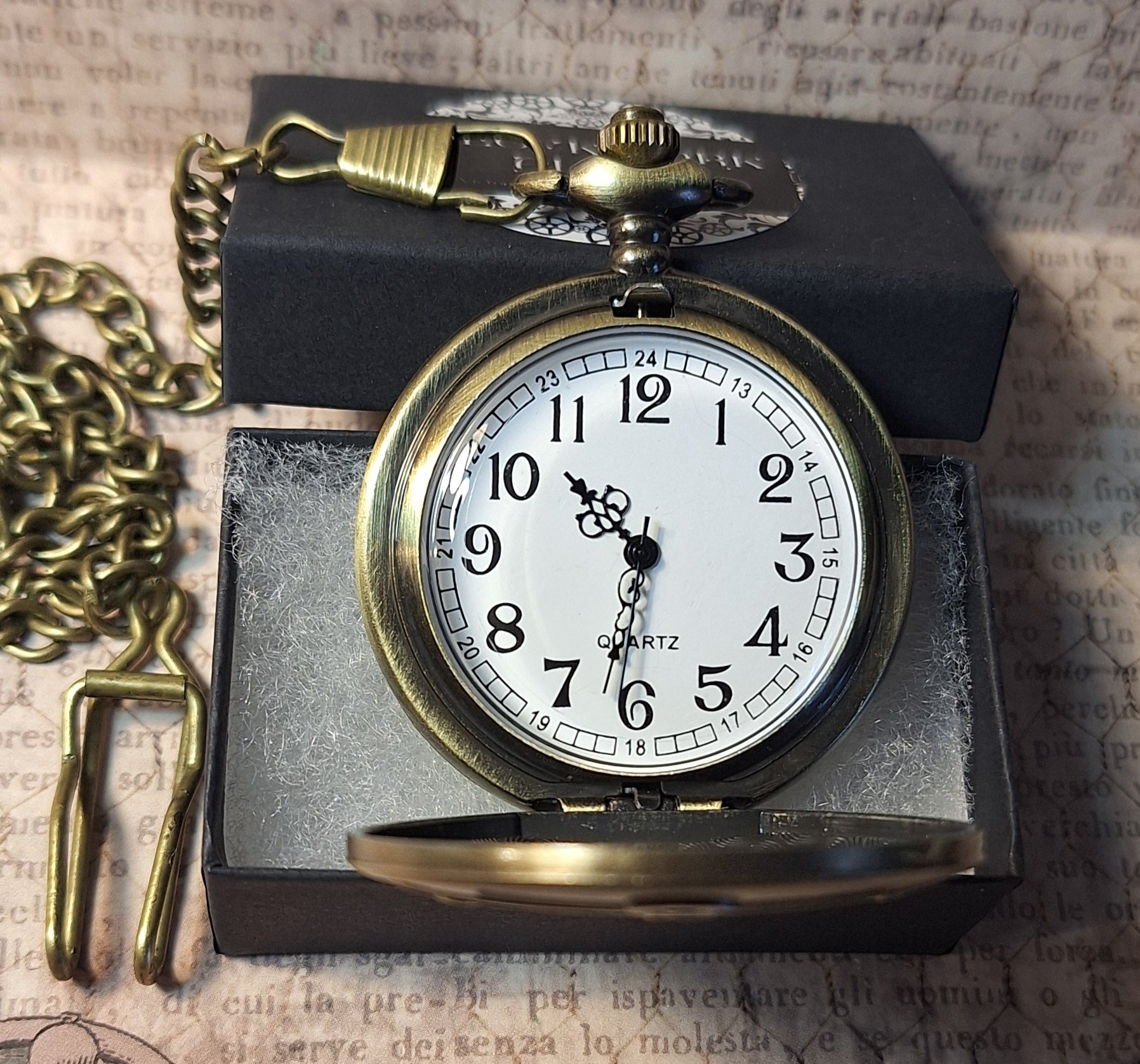 A battery operated working pocket watch in antique bronze finish.