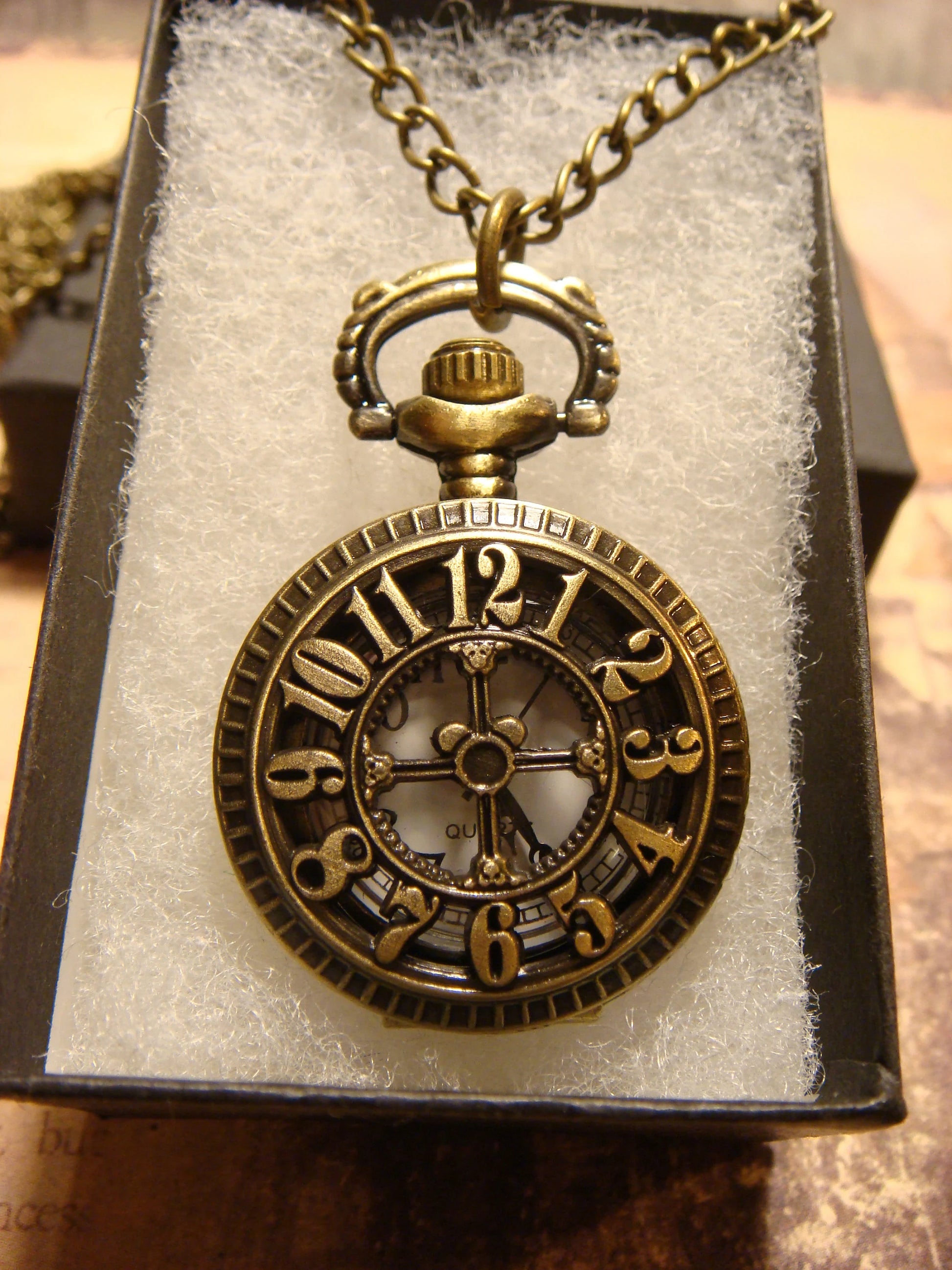This small, functional, battery operated, antique bronze necklace watch hangs on a 30" antique bronze chain.